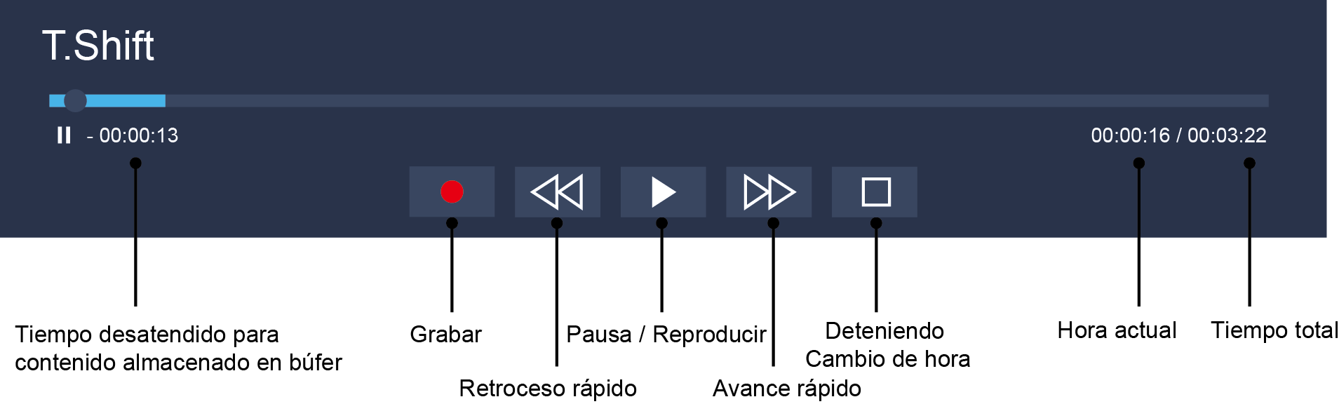 Pulse el botón del mando a distancia para seleccionar Time Shift y aparecerá el menú. Seleccione el ícono para poner en pausa la emisión en vivo y seleccione el ícono